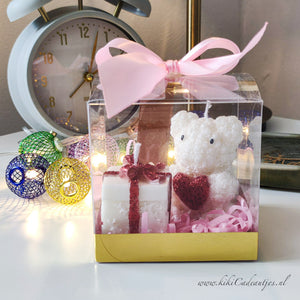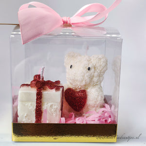 Een perfect duo voor een lief gebaar: deze handgemaakte kaarsenset bestaat uit een schattige beerkaars en een kaars in de vorm van een cadeaudoosje – samen gepresenteerd in een luxe geschenkverpakking.