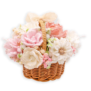 Een bloemenmand die nooit verwelkt: deze unieke handgemaakte mand bevat een betoverende mix van geurige kaarsenbloemen in zachte tinten van roze, wit, blauw en lila.