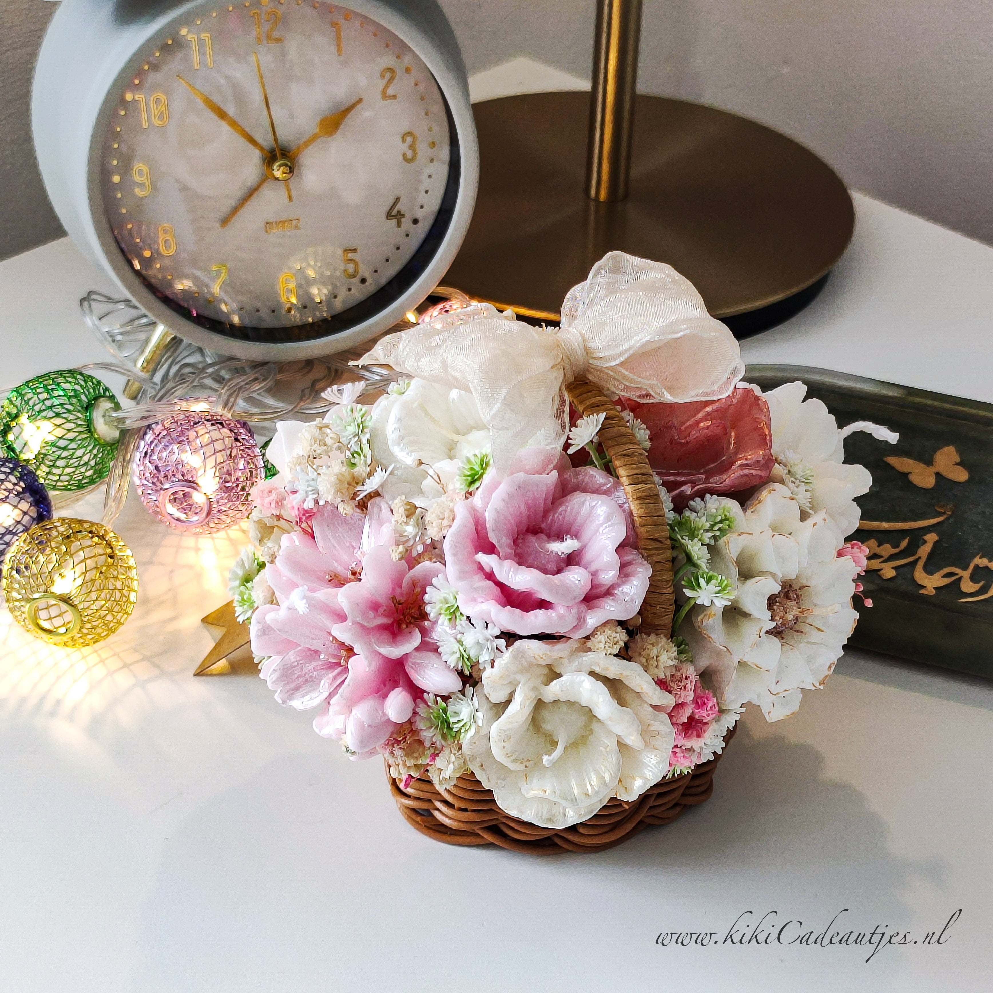 Luxe Geurige Kaarsenbloemen in Rieten Mand – Handgemaakte Cadeaumand met Droogbloemen