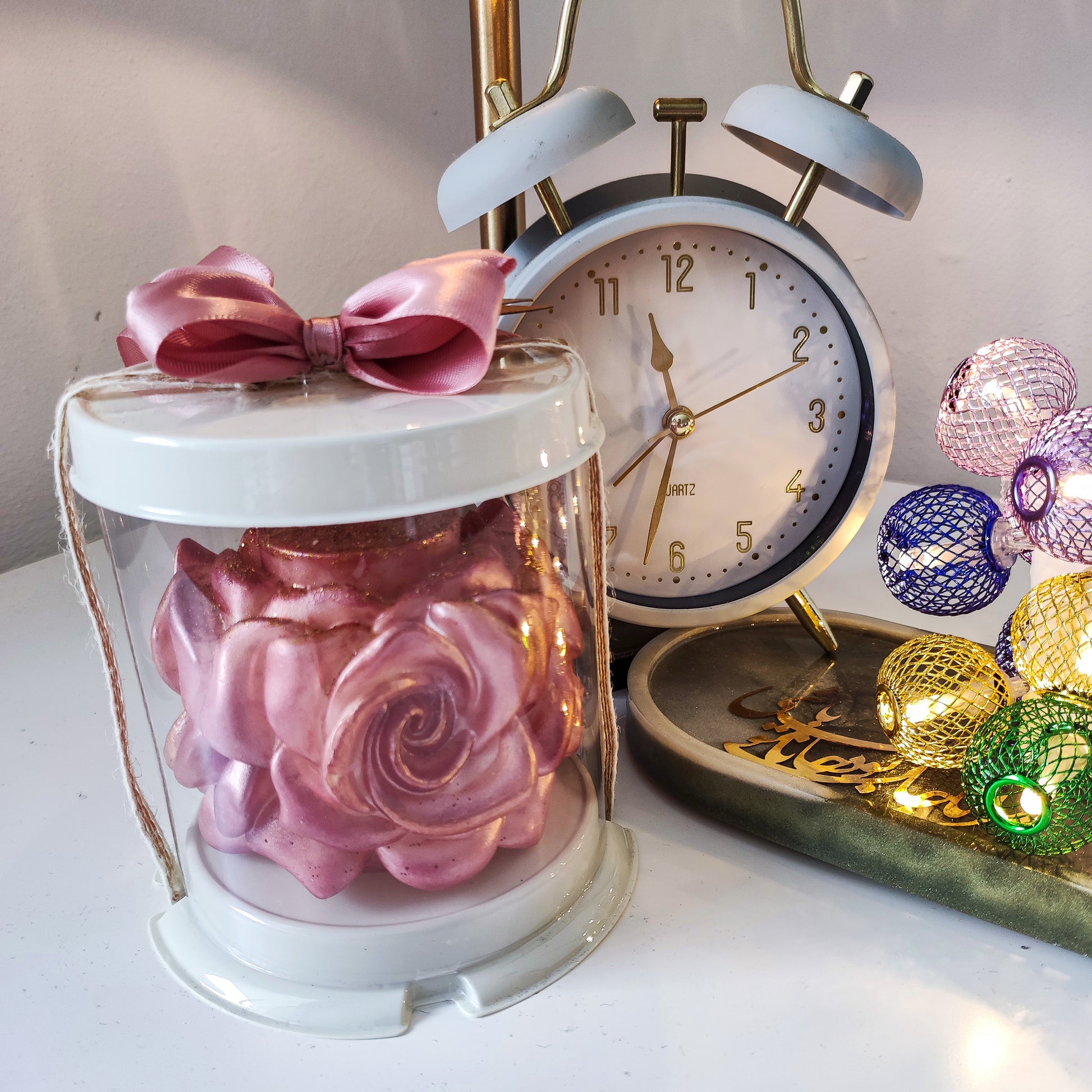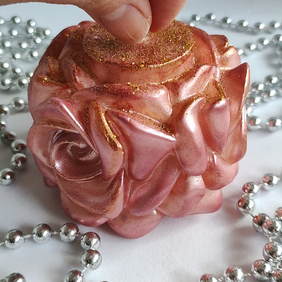 Een meesterwerk in was: deze handgemaakte roze kaars is vormgegeven als een bloemencompositie met drie samengevoegde rozen, afgewerkt met elegante gouden accenten.