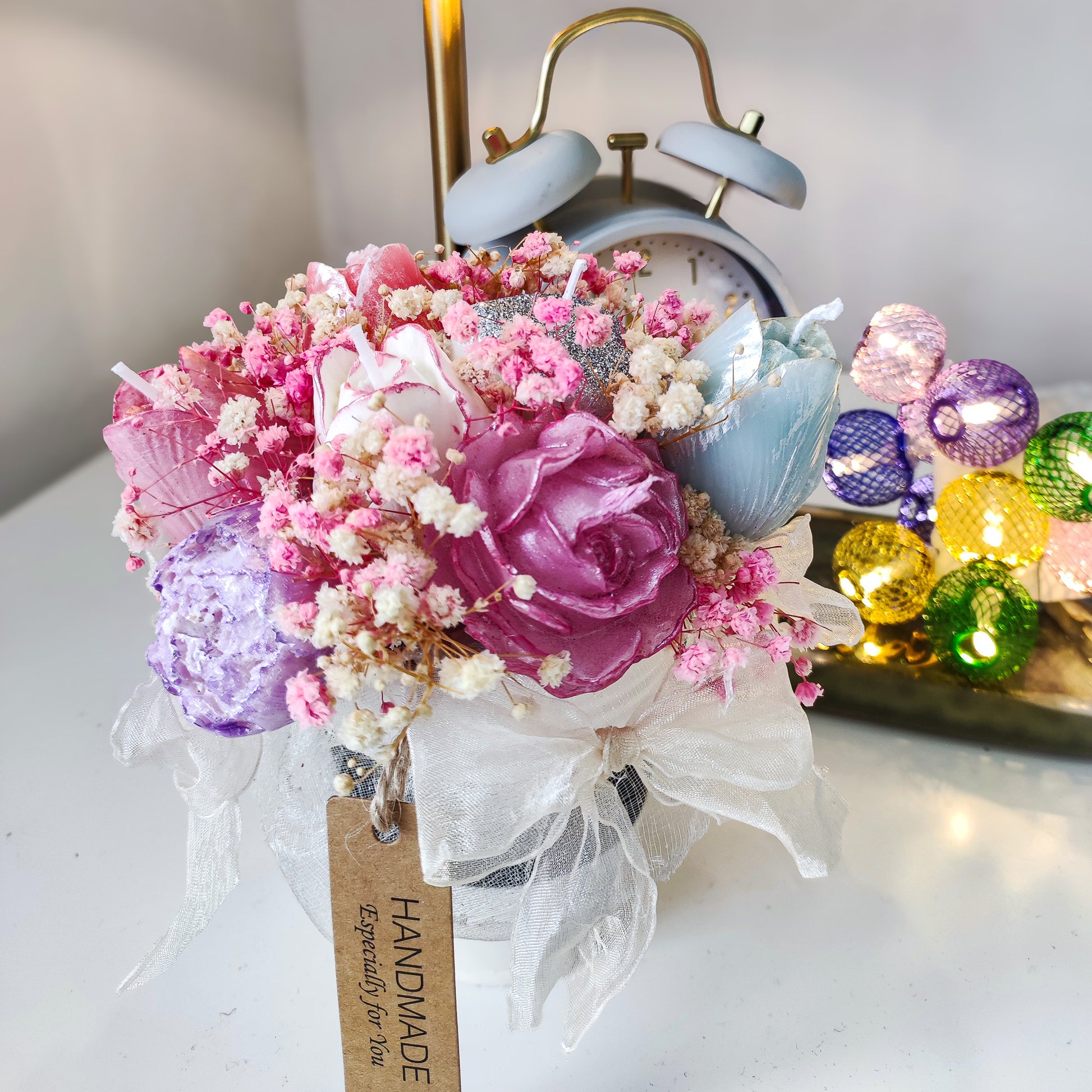 Handgemaakte Kaarsenbloemen in Decoratieve Emmer – Luxe Geurkaarsenboeket met Droogbloemen