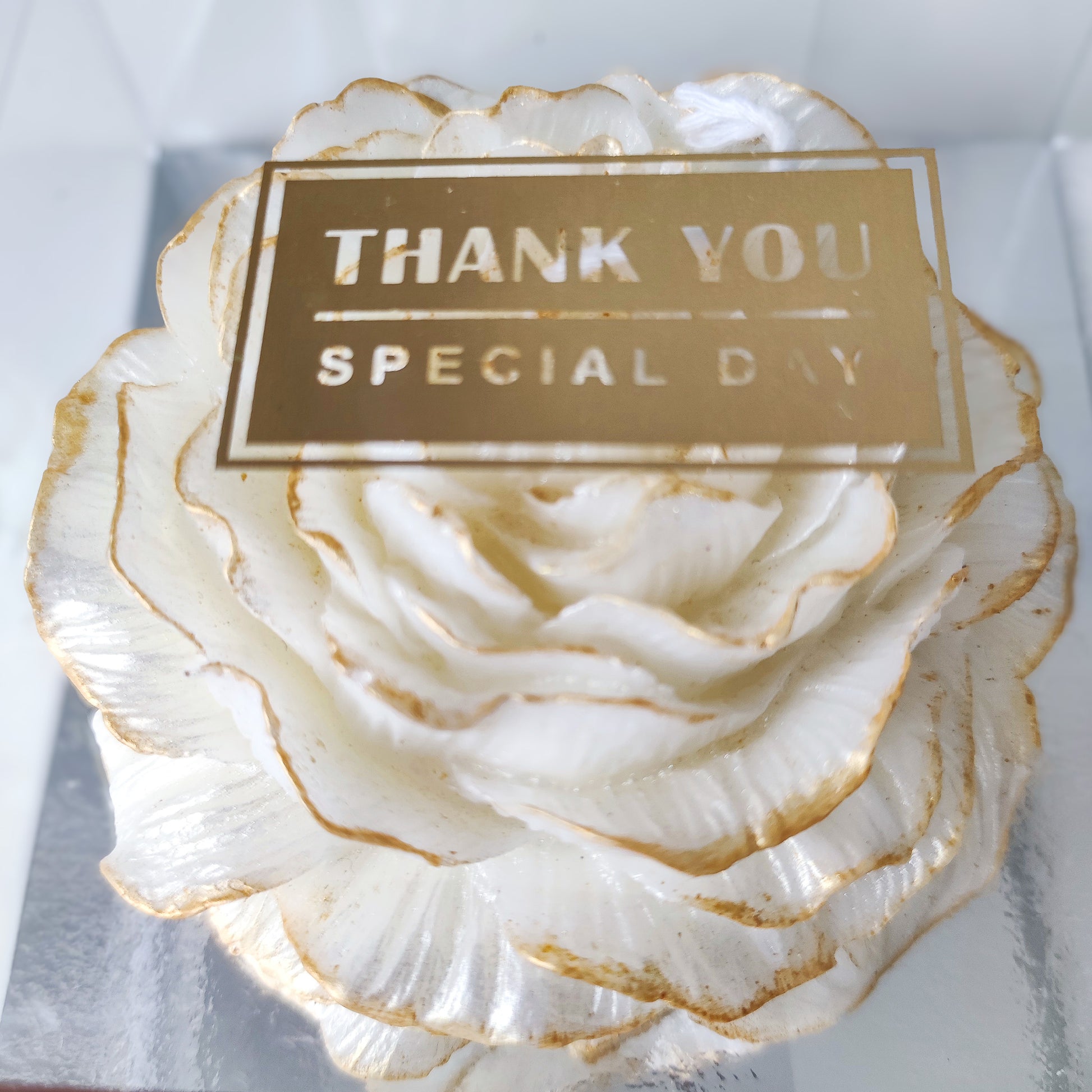 Breng tijdloze elegantie in huis met deze handgemaakte bloemenkaars in de vorm van een witte ranonkel, verfijnd met gouden accenten.