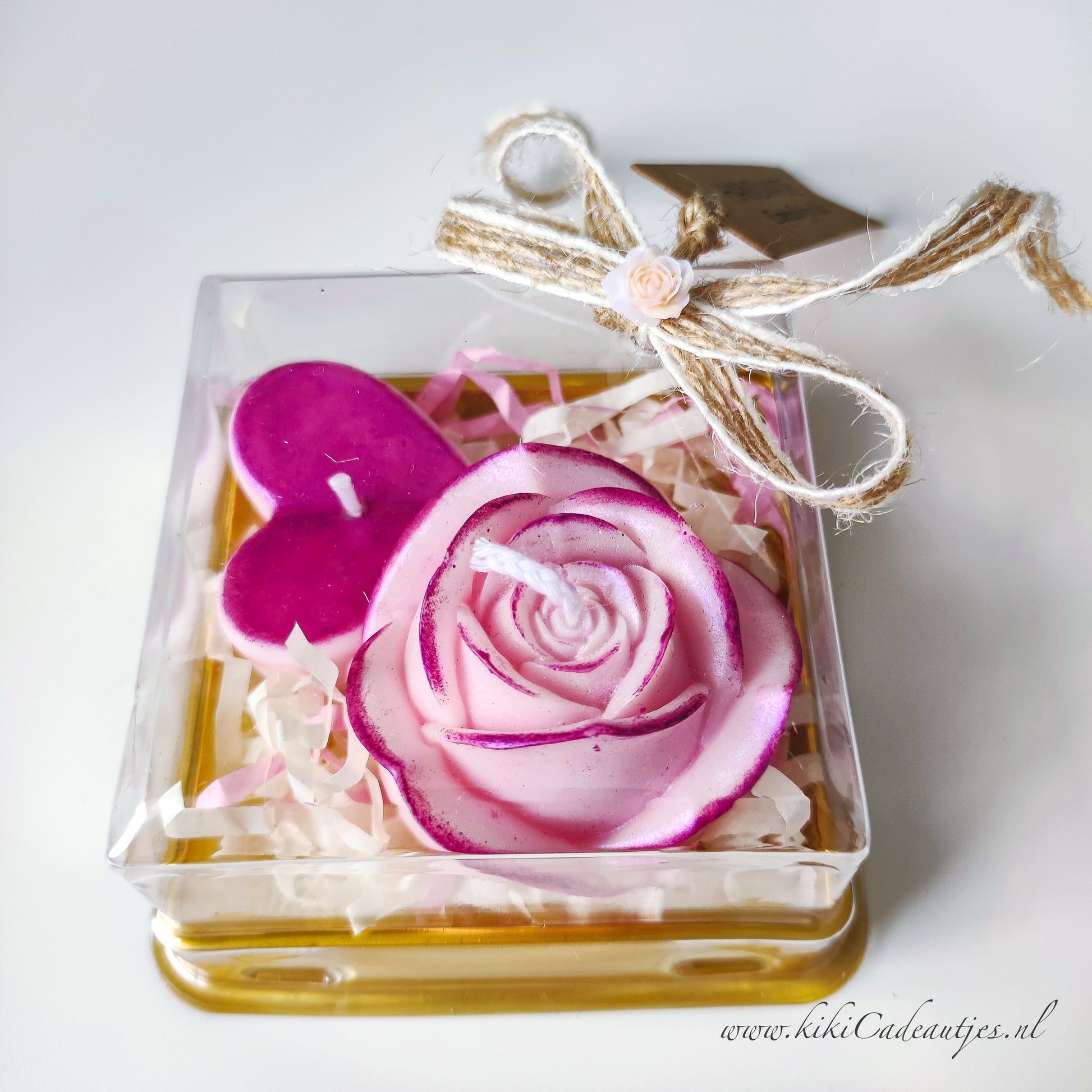 Een uniek handgemaakt kaarsensetje bestaande uit een elegante rozenkaars en een hartvormige kaars, prachtig gepresenteerd in een luxe geschenkdoos.